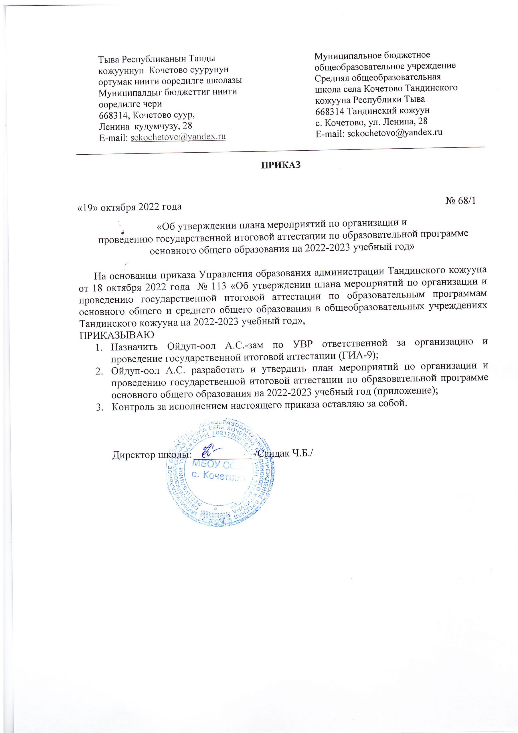 ГИА Для учащихся и родителей:ФИППИ ЕГЭ-http://www.kremlinrus.ru/article/181/113674/Минпросвещения России https://edu.gov.ru/Сдам ГИА: Решу ВПР, ОГЭ, ЕГЭ https://sdamgia.ru/ Правила-заполнения-бланков-ЕГЭСкачать Продолжительность-ЕГЭСкачать Советы-выпускникамСкачать Отчет работы-по-Зимней-школеСкачать Приказ-Минпросвещения-об-утверждении-единого-расписания-ГИА-2023Скачать Приказ-Минобра-РТ-О-проведении-тренировочного-мероприятия-по-русскому-языку-9-кл-13-апреля-Скачать Приказ-Минобр-РТ-от-14-декабря-№1193-Об-утверждении-плана-мероприятийСкачать Приказ-МКУ-Управление-образования-ИССкачать Приказ-МКУ-Управление-образования-о-проведении-пробного-экзаменпо-мат.и-русс.яз.-в-9-кл.Скачать Приказ-113-МКУ-Управления-образования-об-утверждении-плана-мероприятий-ГИА-2023Скачать Постановление-администрации-Тандинского-кожууна-ГИА-2023Скачать приказ-99-2Скачать Расписание-ГИА-2023Скачать Расписание-РПР-род.яз.-Апрель-2023-г.Скачать Школьный-приказ-от-07.11.2022-о-проведении-региональных-замеров-по-тувинскому-языку-в-4.-9-11-классахСкачать Школьный-приказ-от-19-октября-2022-об-утверждении-плана-мероприятий-ГИАСкачать Школьный-приказ-от-27-апреля-2023-о-проведении-РПР-по-тувинскому-языкуСкачать Школьный-приказ-от-30-января-2023-о-проведении-итогового-собеседования-в-9-классеСкачать